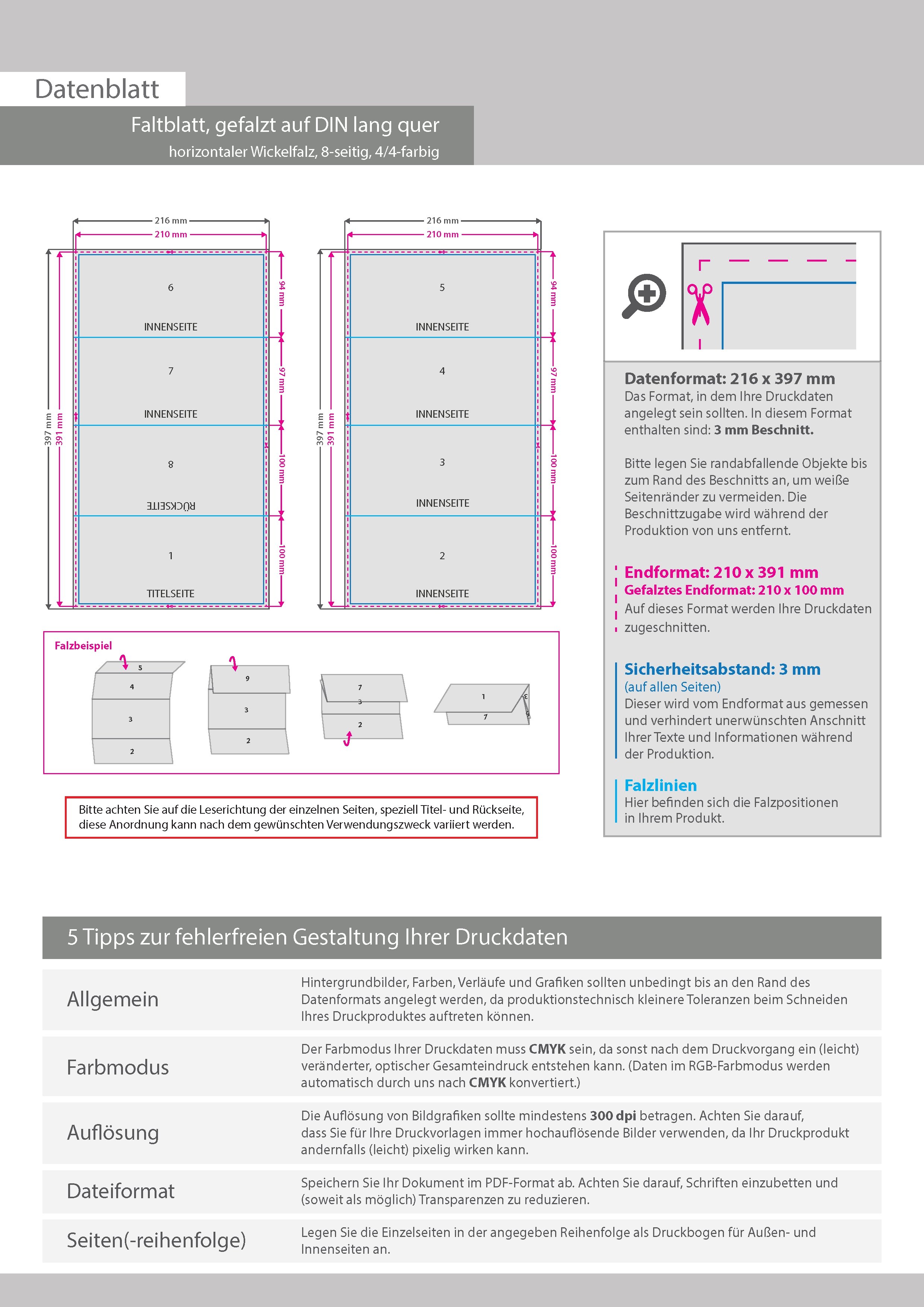 Faltblatt, gefalzt auf DIN lang quer, horizontaler Wickelfalz, 8-seitig