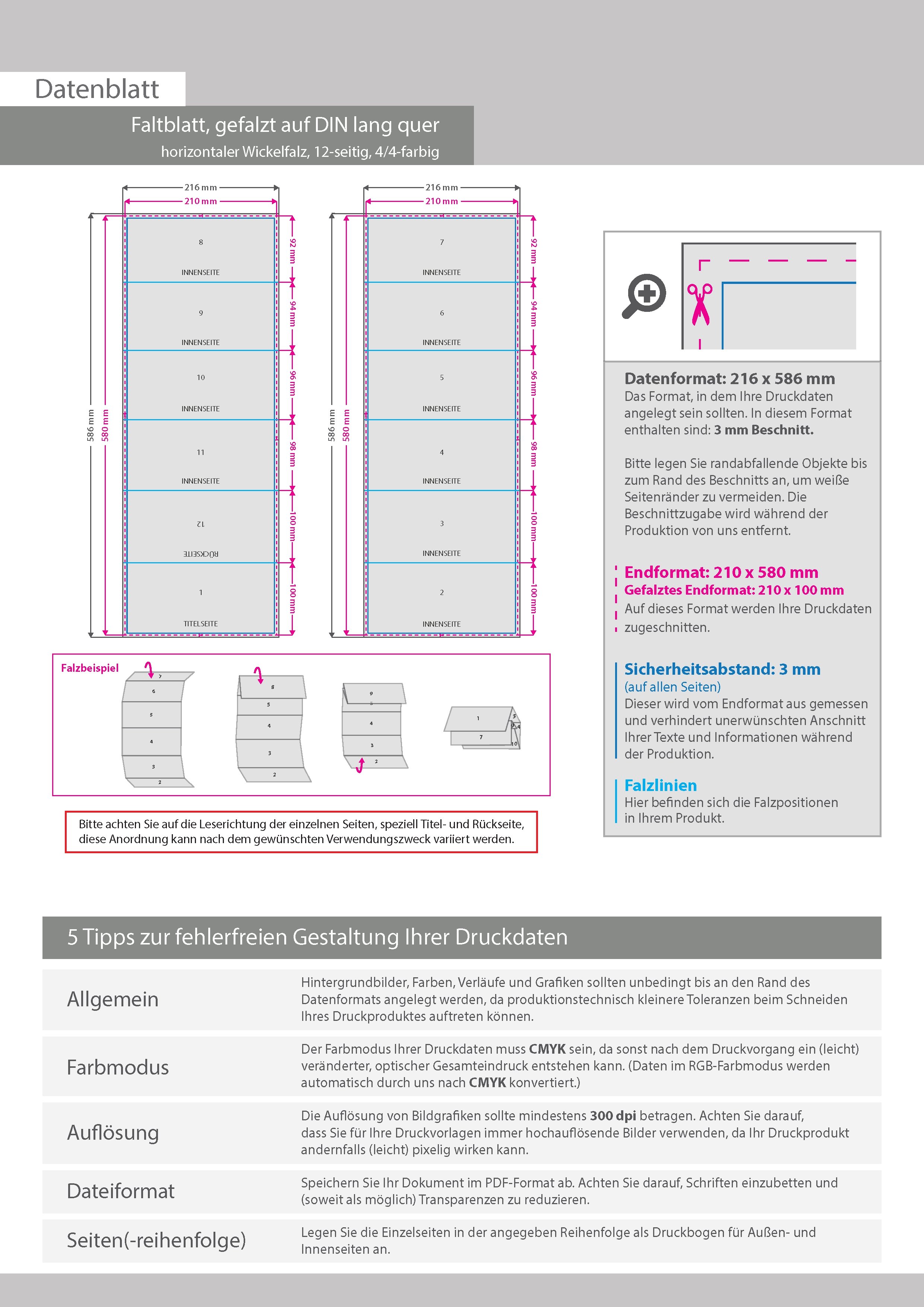 Faltblatt, gefalzt auf DIN lang quer, horizontaler Wickelfalz, 12-seitig